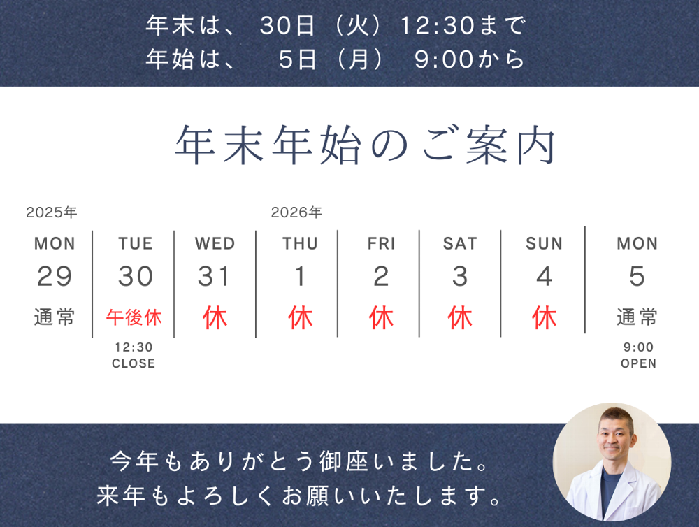12/30午後~1/4までお休みさせていただきます。 2026年は1/5(月)9:00からです。 今年も一年ありがとう御座いました。 来年もよろしくお願いいたします。 よいお年をお迎えください。^^ 投稿者プロフィール Gakuji Kojimaこじま富雄団地接骨院院長 業界に20年以上携わり、日々の施術の傍ら学会講師としても活動中。経絡治療学会阪神部会副部会長・講師 最新の投稿 お知らせ2025年12月22日年末年始のお知らせ お知らせ2025年11月10日臨時休診のお知らせ 今月のツボ2025年10月19日テニス肘に効くツボ 今月のツボ2025年9月8日四十肩・五十肩に効くツボ