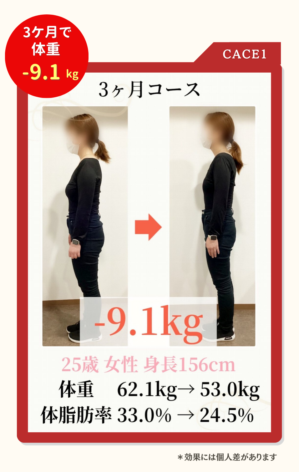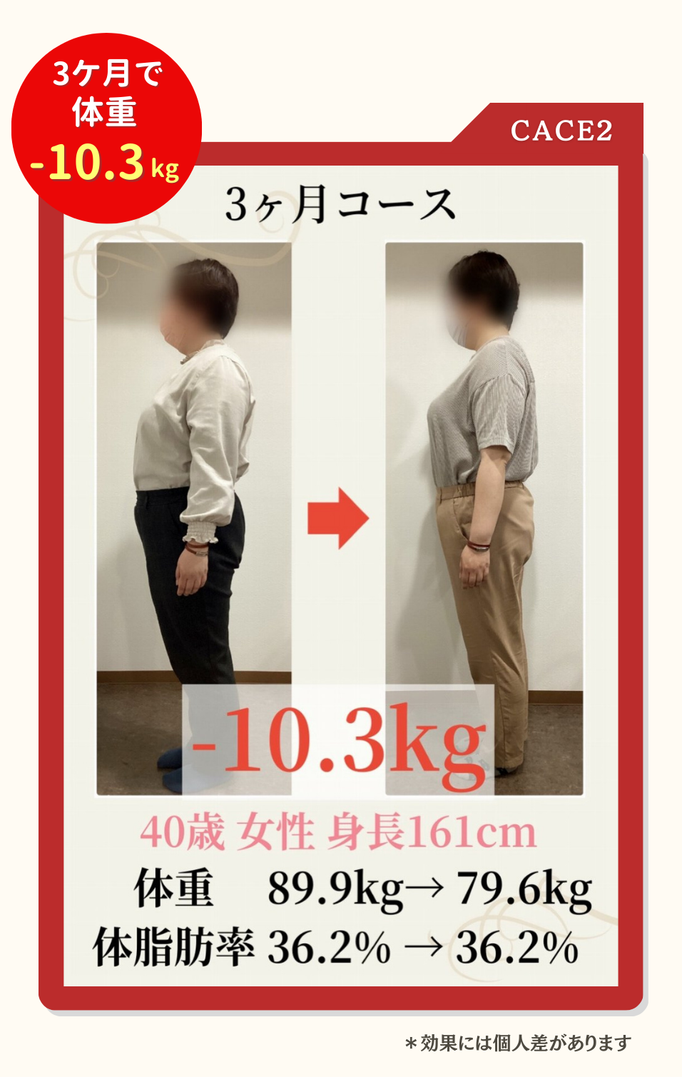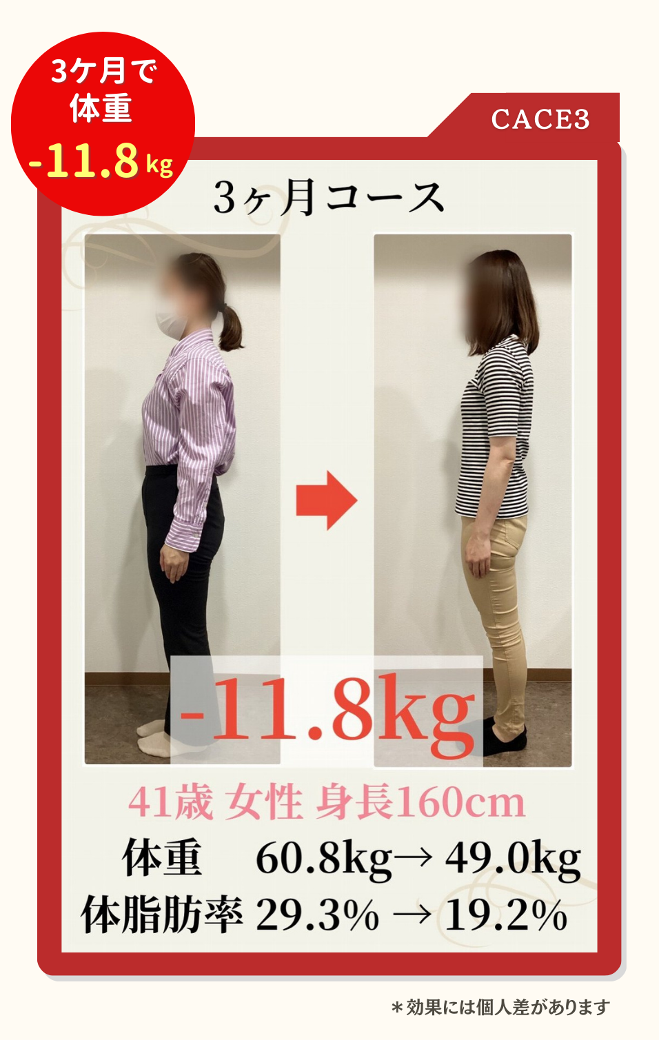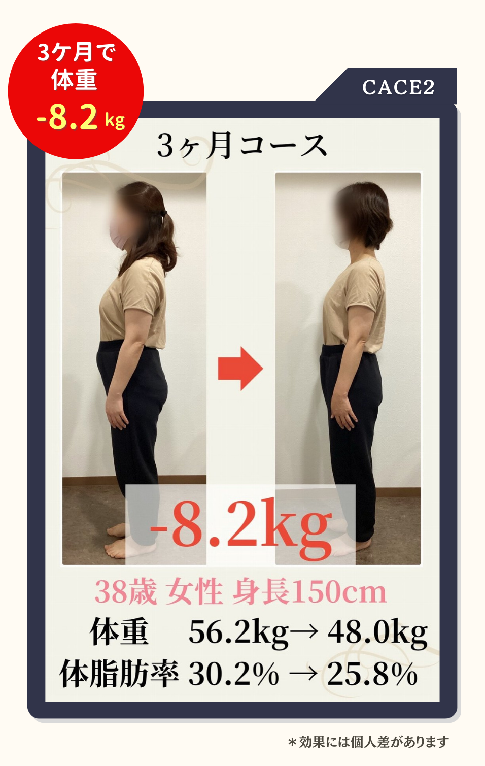個人差がありますが3ケ月で8~10kg程度痩せる方が多いです。(効果を保証するものではありません)