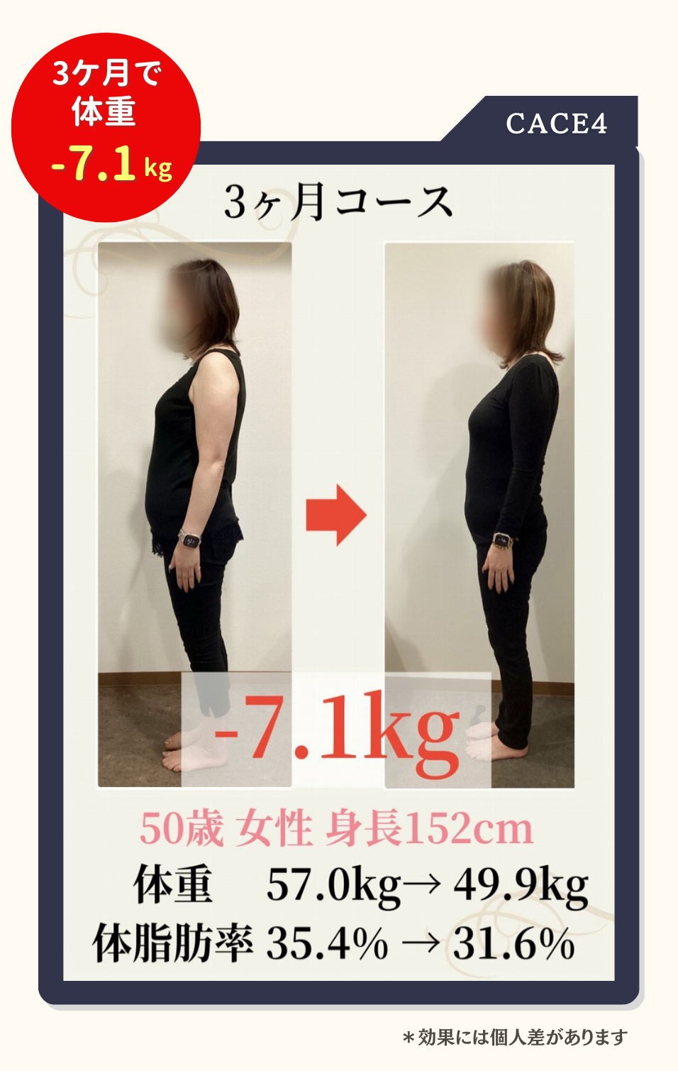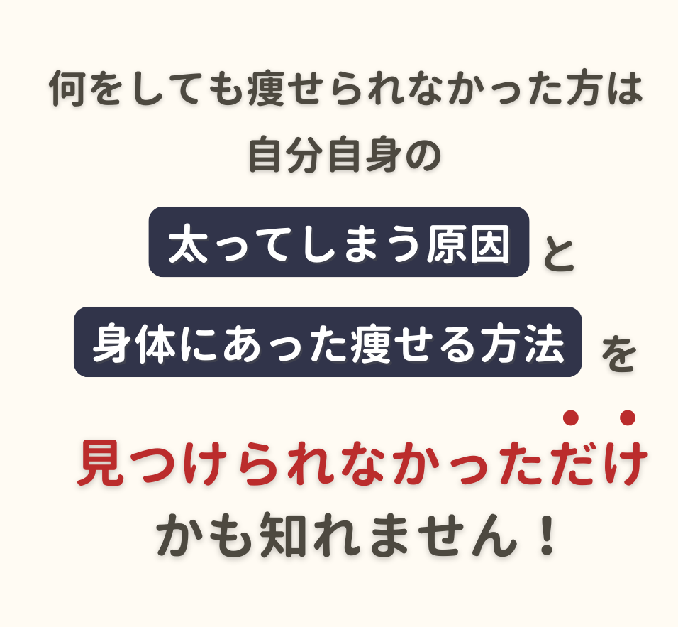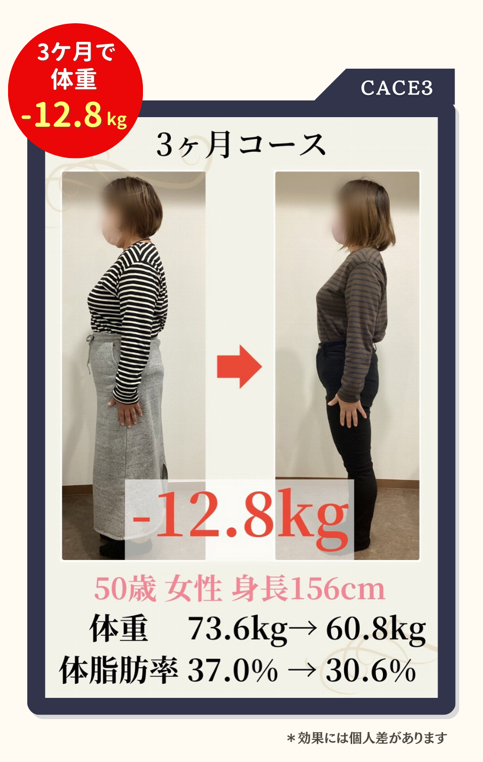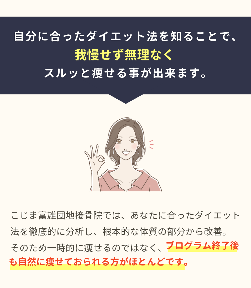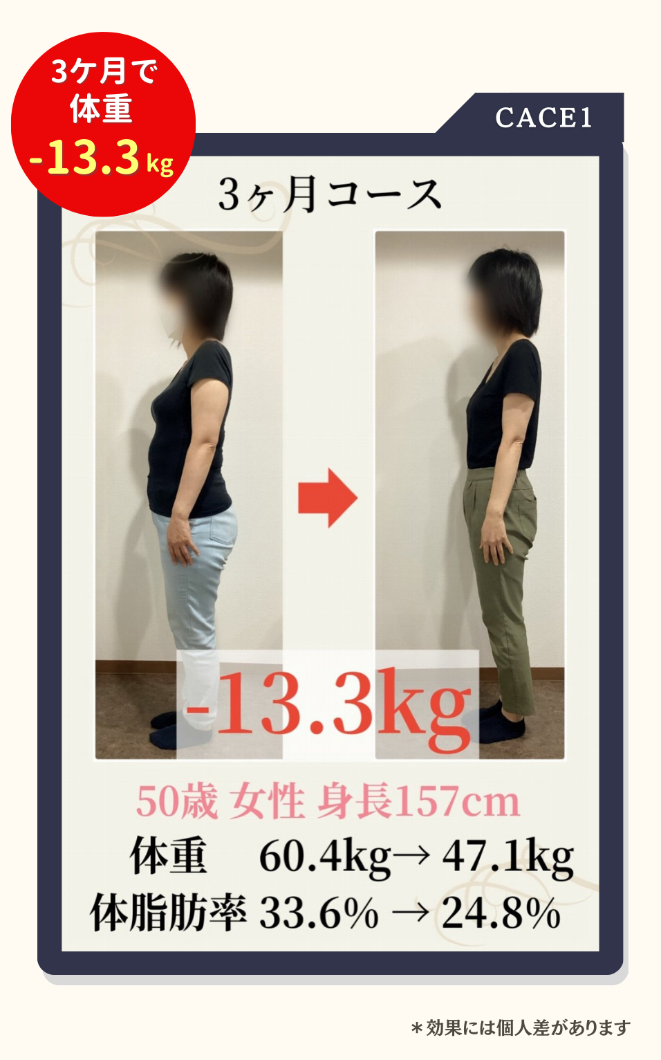 個人差がありますが3ケ月で8~10kg程度痩せる方が多いです。(効果を保証するものではありません)